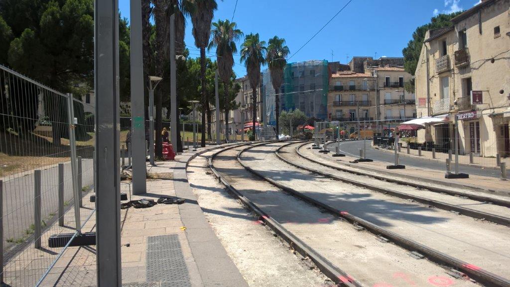 Rue du Faubourg-de-Nîmes à Montpellier, photographie de rails dénudés des voies du tronc commun aux lignes 1 et 4 de tramway, le vendredi 24 juillet 2020. Copyright : Edouard Paris