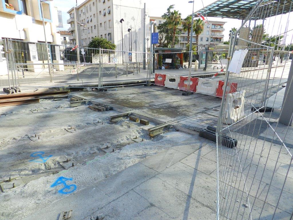 Rue du Faubourg-de-Nîmes à Montpellier, aperçu de la limite entre les rails à gorge conservés côté station « Corum », quais communs aux lignes 1 et 4 de tramway, et les nouveaux rails à gorge à poser dans la rampe. Photo prise le dimanche 2 août 2020. Copyright : Anje34
