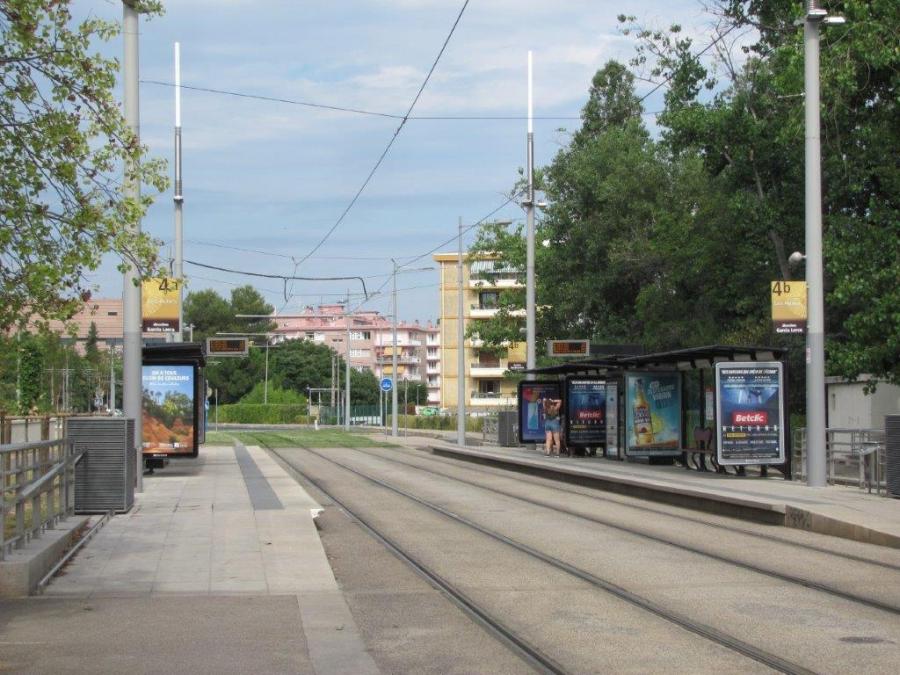La station « Les Aubes » ne sera pas desservie par les rames de la ligne 4 de tramway du samedi 4 juillet au dimanche 30 août 2020. Durant cette même période une navette bus baptisée « Navette 4 » marquera l’arrêt à proximité dans chaque sens de circulation entre « Corum » et « Léon Blum ». Photo prise le jeudi 2 juillet 2020. Copyright : Edouard Paris