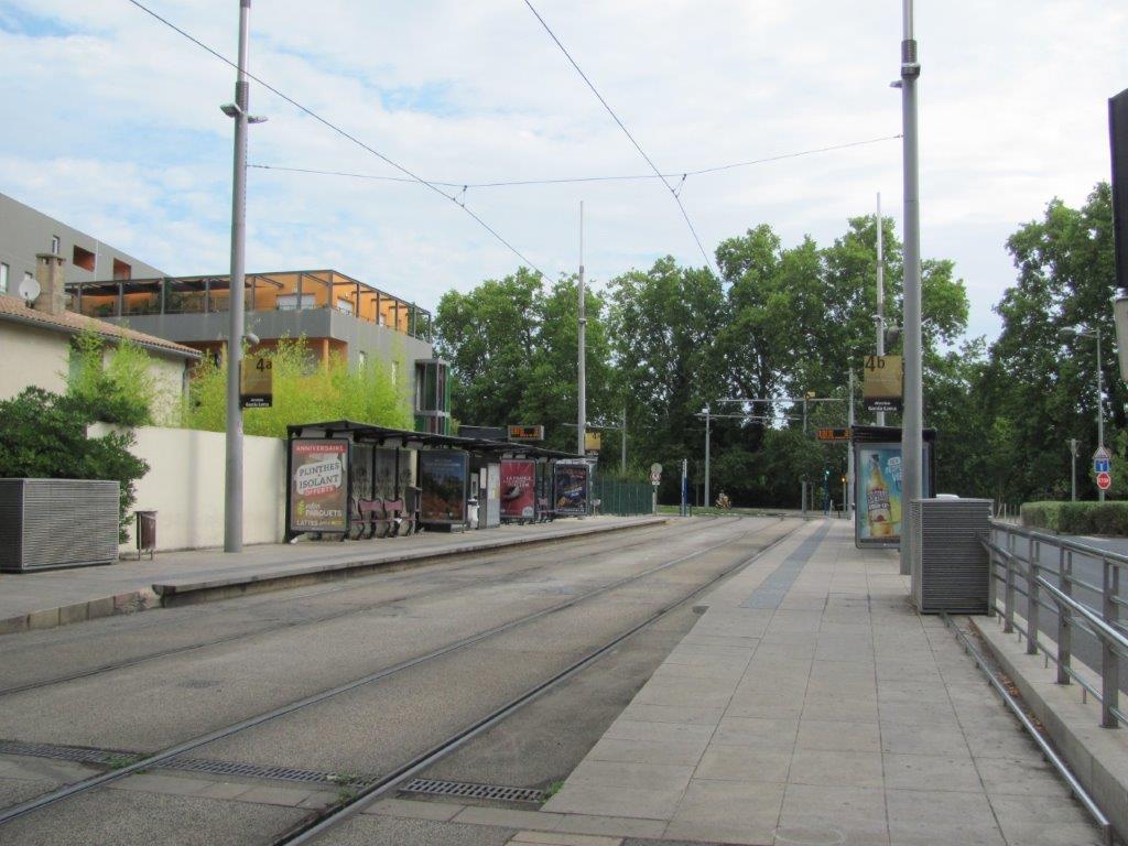 La station « Pompignane » ne sera pas desservie par les rames de la ligne 4 de tramway du samedi 4 juillet au dimanche 30 août 2020. Durant cette même période une navette bus baptisée « Navette 4 » marquera l’arrêt à proximité dans chaque sens de circulation entre « Corum » et « Léon Blum ». Photo prise le jeudi 2 juillet 2020. Copyright : Edouard Paris