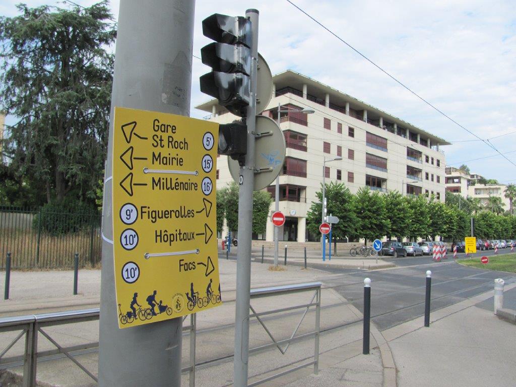 Temps de parcours à vélo vers plusieurs directions à partir du compteur vélo de l’avenue Bouisson-Bertrand à Montpellier. Photo prise le jeudi 2 juillet 2020. Copyright : Edouard Paris