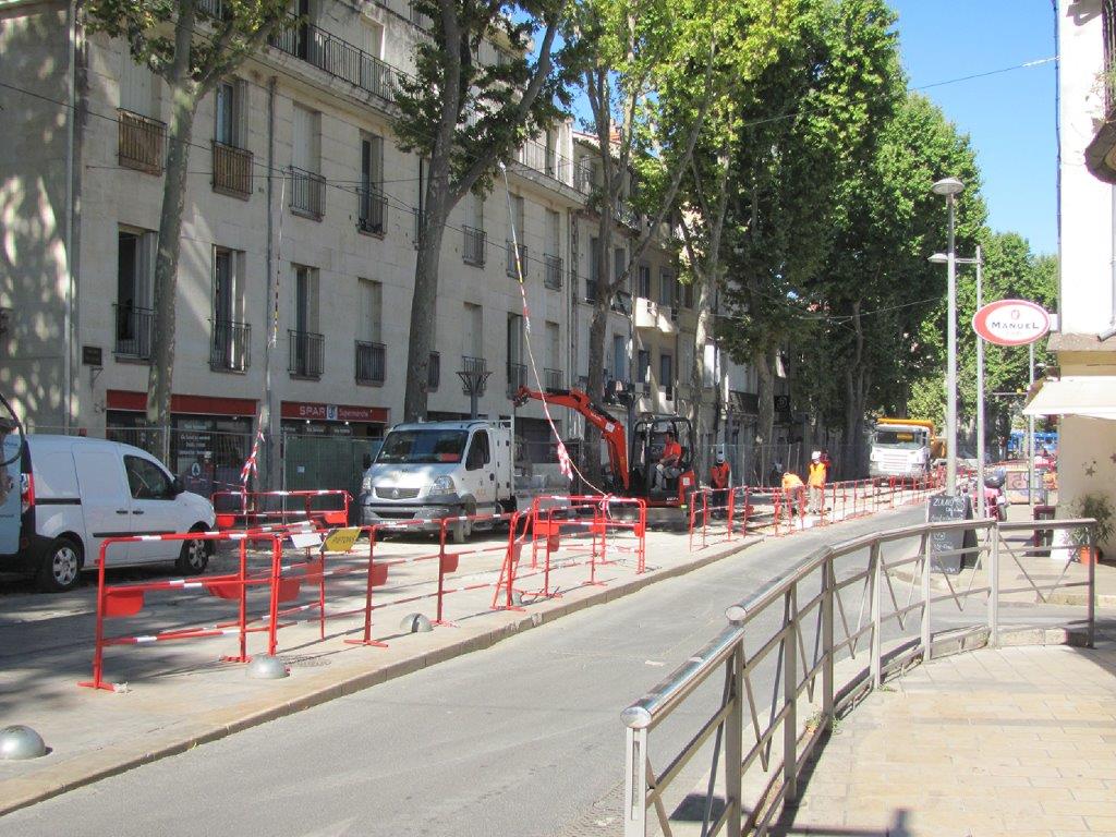 Aperçu du chantier de réfection du revêtement de la plateforme du tronc commun des lignes 1 et 4 de tramway au début du boulevard Pasteur en direction de la place Albert-1er à Montpellier, le vendredi 17 juillet 2020. Copyright : Edouard Paris