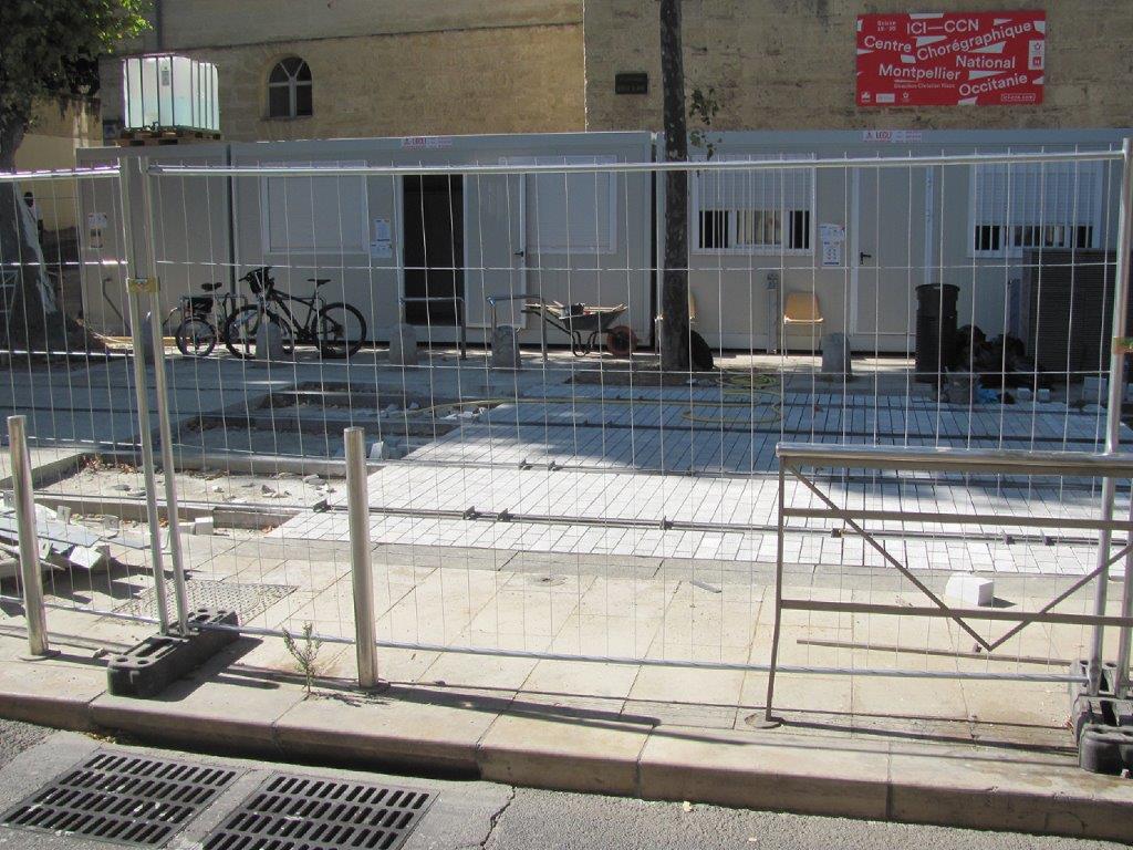 Boulevard Louis-Blanc à Montpellier, des pavés de béton ont été minutieusement posés sur la plateforme du tronc commun des lignes 1 et 4 de tramway. Photo prise le vendredi 17 juillet 2020. Copyright : Edouard Paris